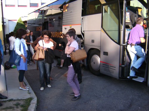 Mehr oder weniger ausgeschlafene Menschen, aufgepackt mit Instrumenten und Koffern bilden ein erstes Grüppchen, eine kleine Herde, die sich stetig vergrößert.Auch Stefan, unser Leittier, Rudelführer (sprich: Dirigent) ist zur Stelle. Jetzt fehlt nur noch der Bus. Leichte Zweifel steigen auf, ob wohl alles organisiert ist. Doch da öffnet sich ein riesiges Maul und entlässt ein Ungetüm von einem Bus. (Das Maul ist natürlich das Garagentor des Busunternehmens). Erleichterung macht sich breit.